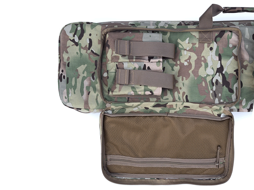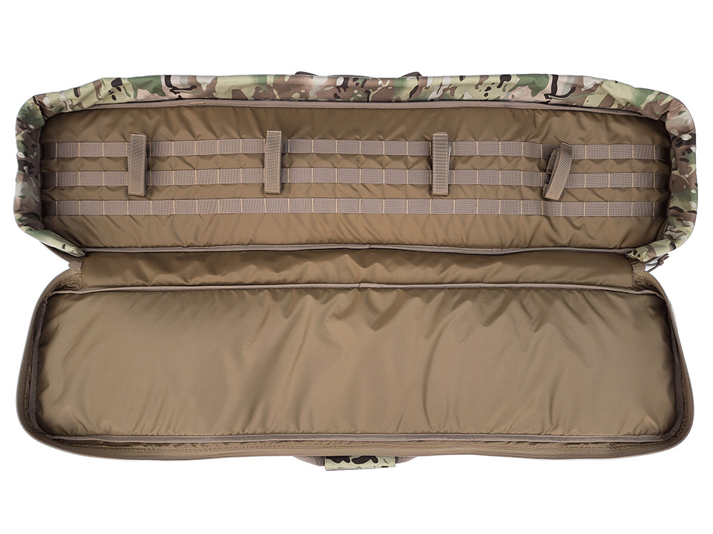 Внутри основного отделения чехла есть панель MOLLE, занимающая всю площадь одной стороны основного отделения. Чехол комплектуется 4шт креплениями для ружья. Крепления фиксируются в системе MOLLE и не прокручиваются благодаря своей конструкции.